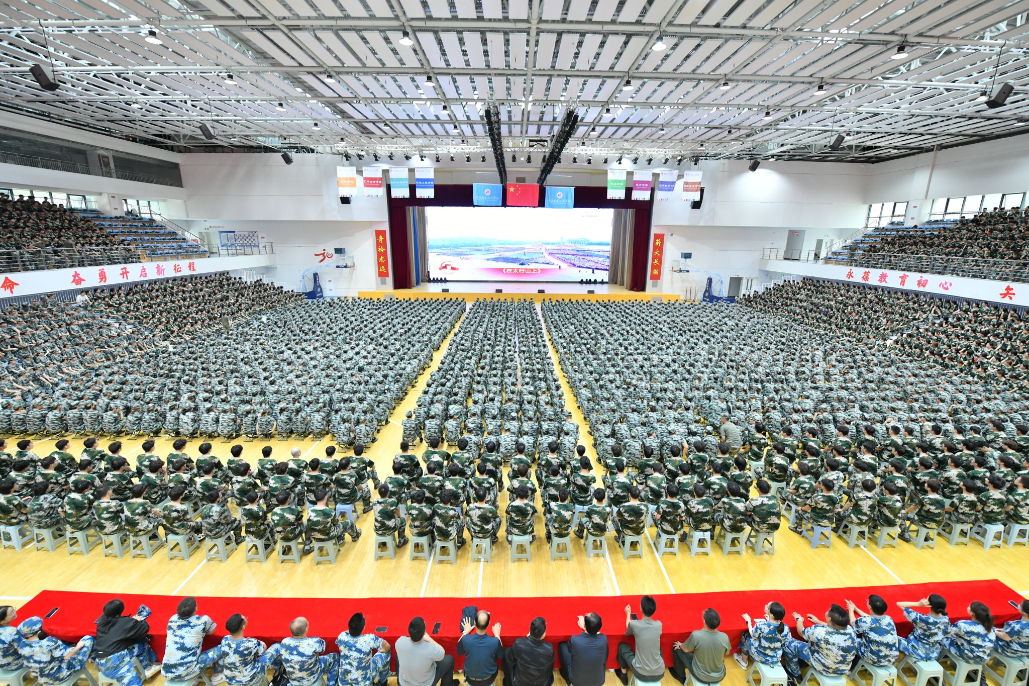 陕服新闻网讯(李文斌)9月1日下午,镐京集团所属陕西服装工程学院、陕西科技大学镐京学院师生齐聚陕服体育馆,开启2025级同学步入大学殿堂的“开学第一课”,开学第一课以“弘扬伟大抗战精神,担负时代光荣使命”为主题,具有深远的意义。镐京集团董事长董事局主席、陕西服装工程学院董事长、陕西科技大学镐京学院董事长吕明,陕西服装工程学院校长姜寿山、陕西科技大学镐京学院校长刘子建,两校校级领导、各二级学院领导、各职能部门负责人,军训团全体教官,2025级全体新生参加。陕西服装工程学院党委书记王岗主持。
