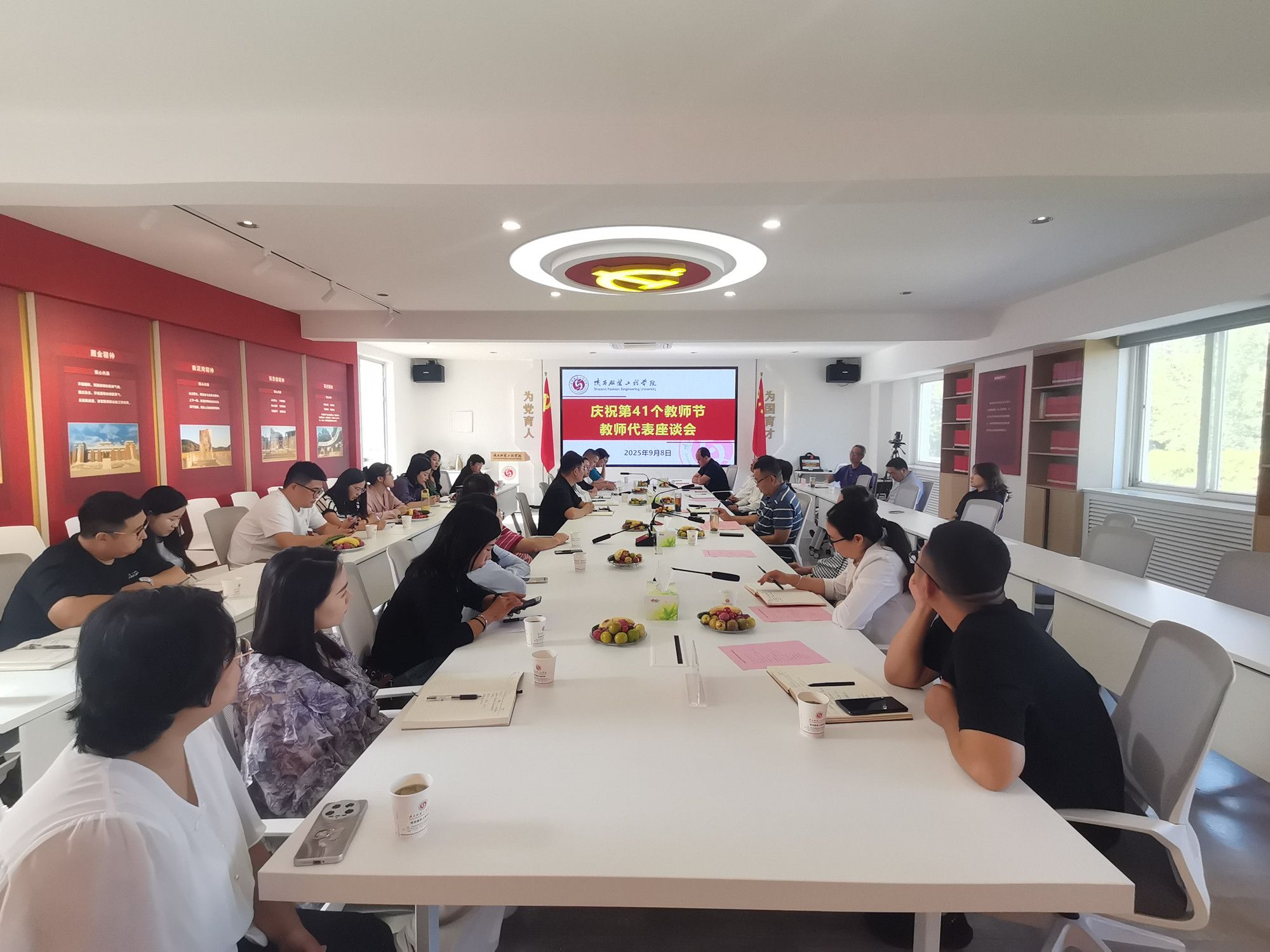 陕服新闻网讯(李文斌)9月8日下午,学校在行政楼326会议室召开庆祝第41个教师节教师代表座谈会,来自各二级教学单位的20余名教师代表参加座谈会。座谈会由校长姜寿山主持,党委书记王岗、常务副校长黄新民、副校长潘庆才、副校长刘运、校长助理翟岁兵以及党政办、党委工作部、教务处、人事处、后勤处负责人出席座谈会。