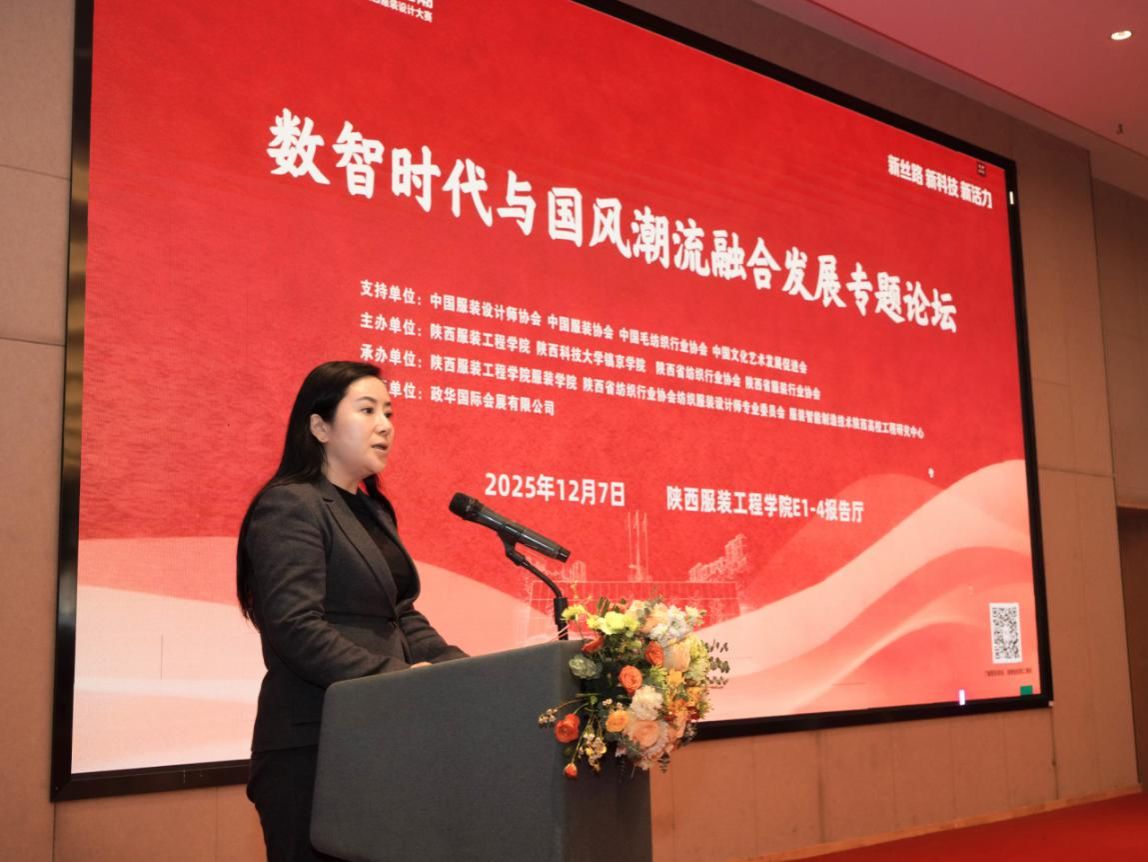 陕西省工业和信息化厅消费品工业处处长李洁讲话,她肯定了近年来陕西服装产业在传承传统文化、拥抱数字变革方面取得的成效,对服装学院金奖得者孙铭麒同学表示祝贺,并指出,数智时代为国风服饰发展提供了广阔空间,希望与会各方以此次论坛为契机,深化合作、协同创新,推动传统文化资源创造性转化、创新性发展,共同打造具有陕西特色、全国影响力的服装产业集群。